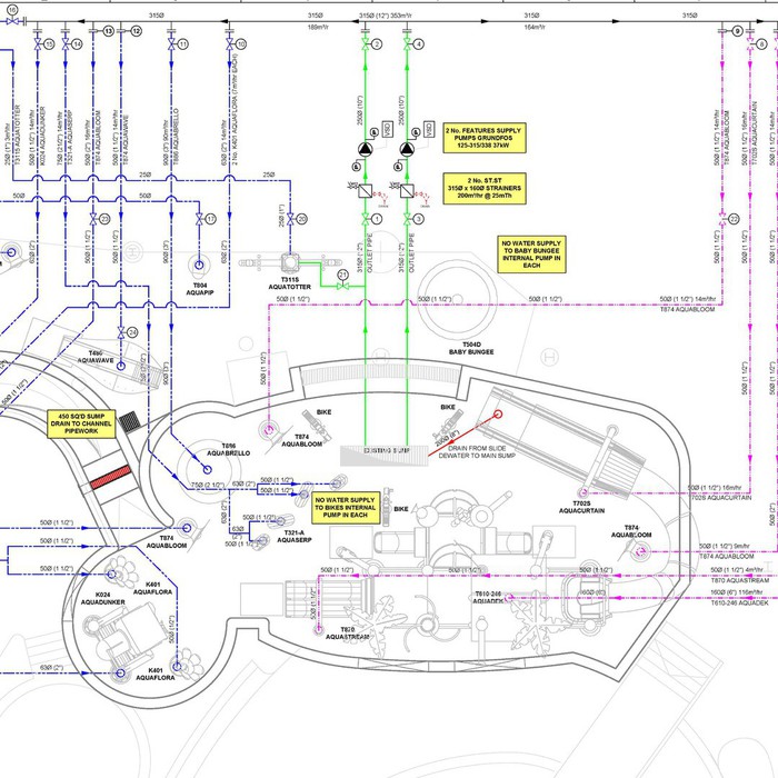 Euro Pools Design Ltd. will co-ordinate closely with the Design Team to develop the overall design and specification of the filtration and mechanical systems associated with the filtration and treatment of all pool water required for all pools and play structure attractions. Euro Pools Design Ltd. will also take into account the client – supplied operating criteria of the features that will affect the engineering design of the aquatic system. In addition to this Euro Pools Design Ltd. will coordinate with the clients production team to ensure that all equipment and design conforms to local codes and are readily available in the local market.